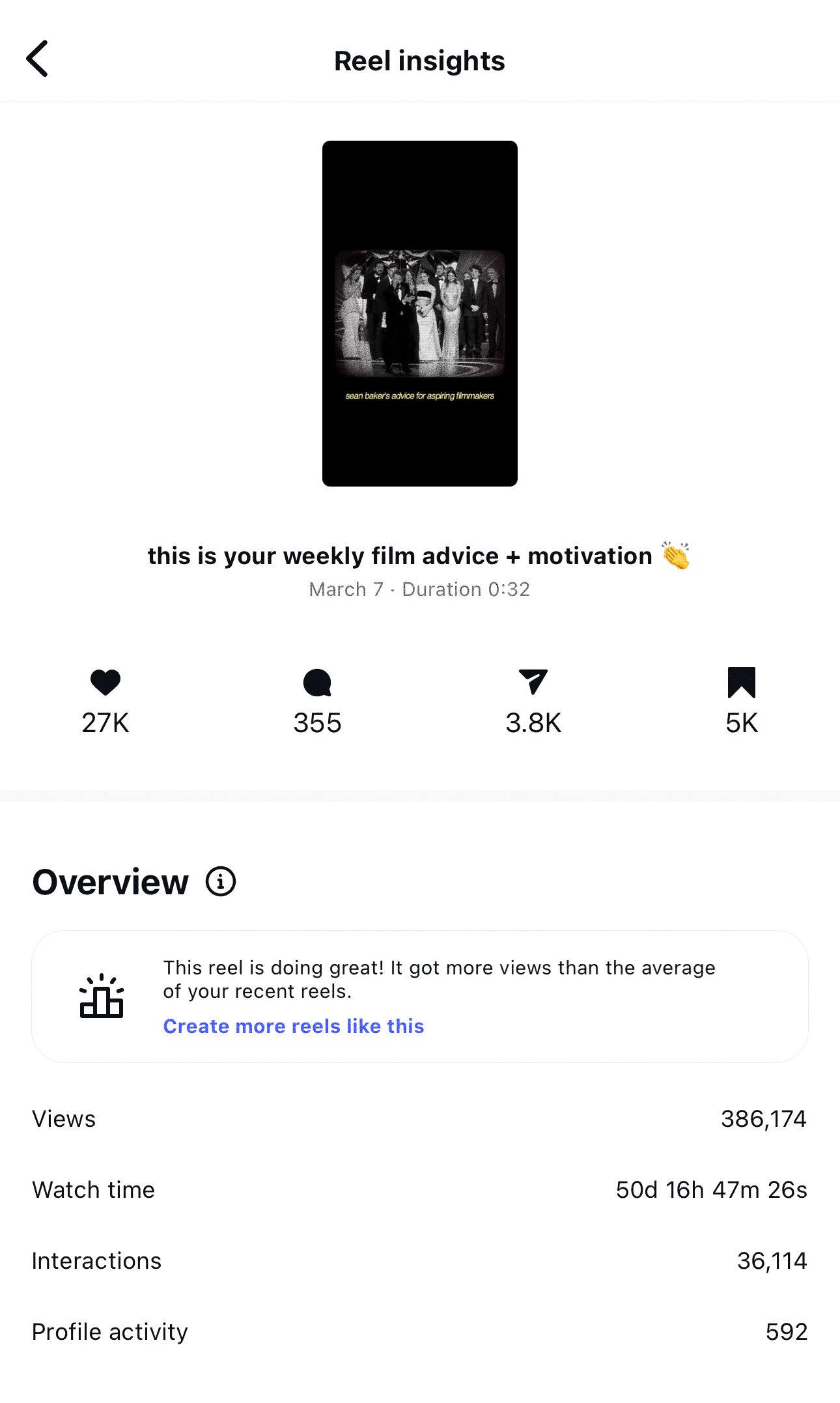 Ofc, the numbers are amazing, but wanna know what’s even better?? The fact that my first viral reel was the perfect one—the one that brought my type of people (filmmakers) into my orbit.
